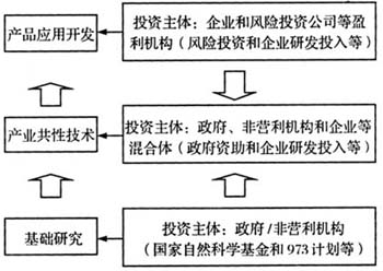 图1 技术类型和投资主体 当前,越来越多的企业开始运用合作研发方式来开发产业共性技术,合作研发的特点包括:避免重复研发以节省成本,共享资源和技术高度协同以突破关键技术,研发资金规模投入以突破经费瓶颈(Vonortas,1997; tao&Wu,1997; Kline,2000)[9][10][11]。例如:日本本田、美国通用和德国宝马三大汽车公司一起研发下一代氢燃料电池技术,以降低燃料电池科技开发成本,同时促进燃料喷嘴与氢供应系统的其他零件标准化;半导体领域互为竞争对手的日本东芝、日立、松下、NEC和瑞萨科技五大半导体制造商,通过融合各自的芯片部门方式建立下一代处理器研发联盟,以减少各自研发支出;半导体厂商英飞凌科技和南亚科技在动态随机存取内存(DRAM)技术方面开展合作,以加强双方在DRAM市场竞争优势并共同分担高昂的研发费用。 许多国家政府普遍认为产业中骨干企业间的合作是一种有利于产业共性技术开发的有效方式,欧盟于1998~2002年开展了框架计划(Framework Program),旨在推动企业合作研究(Co-operative Research),已在电子、化工和机械制造业协调和资助了多个企业合作研发组织;美国SEMATECH计划就是政府亲自牵头组建多个企业参加的合作研发组织;WTO允许政府对科研的补贴,其相关条款规定政府对产业研究的补贴不超过合法成本的75%,对竞争前的开发活动,政府补助不得超过合法成本的50%,所谓产业研究,本质上就是产业共性技术研究。 由于产业共性技术研究处于竞争前(pre-competitive)阶段,这类技术跨越了应用研究和竞争前的试验发展两个阶段,技术优势又往往集中在产业中极少数骨干企业中,这些企业需要在共性技术这个“平台”上进行后续的商业开发,最终形成企业专有的产品(马名杰,2005)[11],企业既需要产业共性技术研发方面的合作,又不得不在最终产品市场进行面对面的竞争,吸引极和排斥极特征直接影响企业合作研发,政府的相关协调和资助政策在平衡吸引极和排斥极特征方面具有关键作用;因此,有必要深入分析影响产业中骨干企业间合作研发的吸引极和排斥极的关键要素特征以及政府相关资助政策的定位,以更有效地发挥政府资助效率,加速我国产业共性技术的开发,提高我国产业在国际上的整体竞争优势。