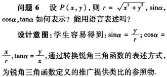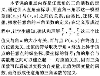 .它的学习既是学科系统内部知识发展的需要,又是坐标思想、数形结合思想、运动变化观念渗透的载体,更是对函数概念理解和认识的一次升华.学习过程中的认知冲突,不同思维的碰撞,易激发学生思维的积极性,有助于探索、创新能力的培养.由锐角三角函数的定义到任意角三角函数的定义是学生认识上的一次突破和飞跃,也是体悟特殊与一般辩证思维的良好素材. 二、学情分析 学生在初中学过的锐角三角函数是以锐角为自变量,相应边的比值为因变量的函数,这是学生学习任意角的三角函数知识的基础和依据,但学生必须面临由特殊到一般的认知过程,必须经历由直角三角形对应边的比值到直角坐标系中坐标与距离比值的转换.当学生在原有认知结构中具备同化新概念的适当观念,具备有意义学习的心向后,更容易激发学生学习的热情,催生创造性思维.当新概念产生后,如何用函数的观念认识理解新概念,把新概念纳入到一般函数的结构之中,既是认识过程中的一道坎,又是认知的一次升华. 三、教学目标 (一)知识与技能 掌握任意角的三角函数的定义,会判断任意角的三角函数的符号,在形成定义的过程中领悟坐标法的优越性,加深对函数概念的理解. (二)过程与方法 引进坐标思想,建立(x,y)与(r,a)之间的关系;通过联想锐角三角函数的定义,思考如何定义任意角的三角函数;理解锐角三角函数是任意角三角函数的特例;通过对比值符号的确定,培养学生掌握、利用规律解决问题的意识. (三)情感态度、价值观 培养学生在运动变化的过程中认识知识的发生和发展,体会知识之间的内在联系,感悟知识的整体性.通过合作交流,培养主动探究新知识的能力. 四、重点、难点 (一)重点 1.对任意角的三角函数定义的理解; 2.正弦、余弦、正切函数值在各个象限内符号的确定. (二)难点 用一般函数的概念理解任意角三角函数的定义. 五、教法、教具 (一)教法 本课采用“引导—探究式”教学方法,将问题以问题串的形式展现,让学生在愤悱中形成认知冲突,体会、感悟数学研究的一般思路和方法. (二)教具 投影仪,多媒体课件. 六、教学过程 (一)概念的引入 问题1 在初中,我们已经学习过锐角三角函数的定义,请回忆在Rt△OMP(∠M=90°)中(如图1):