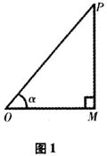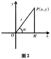 sinα=____,cosα=____,tanα=____,它们是以什么量作为自变量,什么量作为因变量的? 问题2 引入弧度制以后,自变量α在什么范围内变化?sinα,cosα,tanα是两条线段的比值,这些比值在什么范围内变化? 设计意图:以锐角三角函数的定义为起点,以高中函数定义的三要素为依托,将锐角三角函数融入学生已有的函数知识结构中,容易为学生建立起任意角的三角函数获取心理逻辑的自然. 问题3 锐角三角函数的定义域是锐角,当∠α变为钝角时,“∠α的对边,邻边”这些说法还存在吗?此时∠α的三角函数又该如何定义呢? 设计意图:利用∠α的变化作为思维的切入点,打破学生已有的认知结构的平衡,感受学习新知识的必要性——角的范围扩大了,锐角三角函数的定义也应该与时俱进,这有利于将探究的主动权交给学生. (二)概念的形成 问题4 我们曾研究过多种函数的性质,请回忆:在研究函数的性质时,通常是借助什么工具来实现的? 设计意图:依托学生已有的经验,启发学生联想,触发学生的灵感,形成用坐标法解决问题的心向. 问题5 如果让你把图1中的直角∠OMP放置于直角坐标系中(或利用图1建立直角坐标系),怎样放置比较合适? 设计意图:数学实验是数学学习所必需的.或许不同的学生会有不同的方法,但对通过点P的坐标表示的讨论,可以让学生在选优的过程中达成共识(如图2).