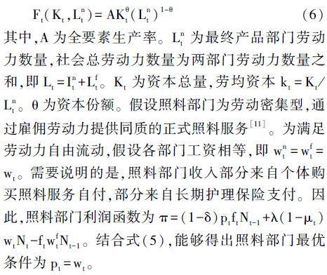 3.企业。企业分为最终产品部门和照料部门。其中,最终产品部门从事实物产品生产性工作,照料部门从事医疗护理、生活照料等服务性工作。假设最终产品部门资本完全折旧,生产函数符合Cobb-Douglas形式,即: